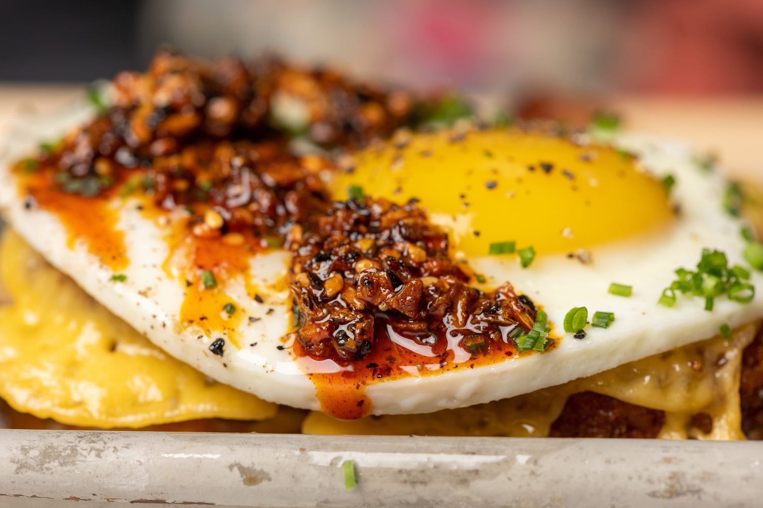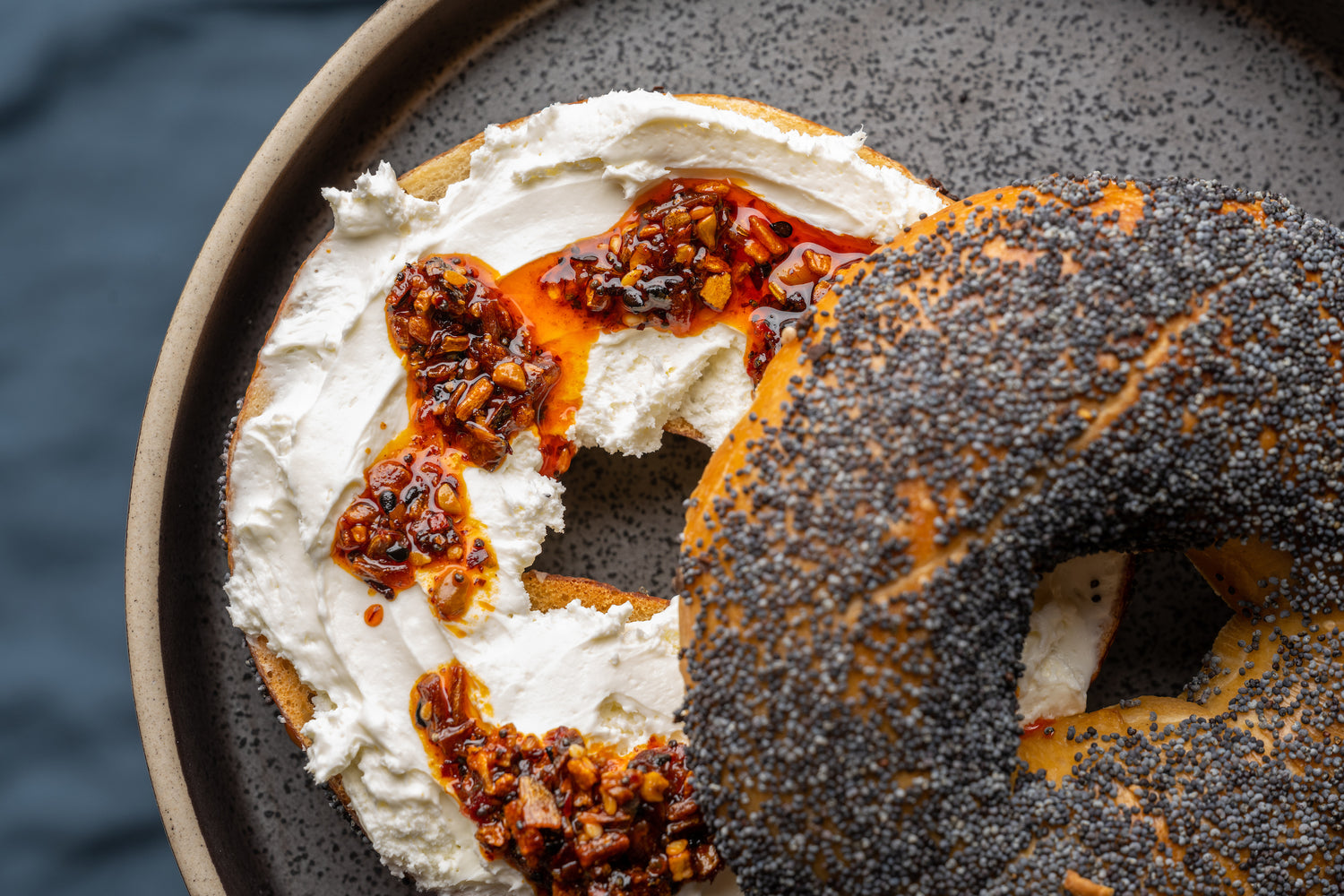 Sesame, poppy, and sunflower seeds join forces with caraway and crunchy bits of fried onion and garlic in an umami rich chile-garlic oil to transport you to spicy bagel heaven.